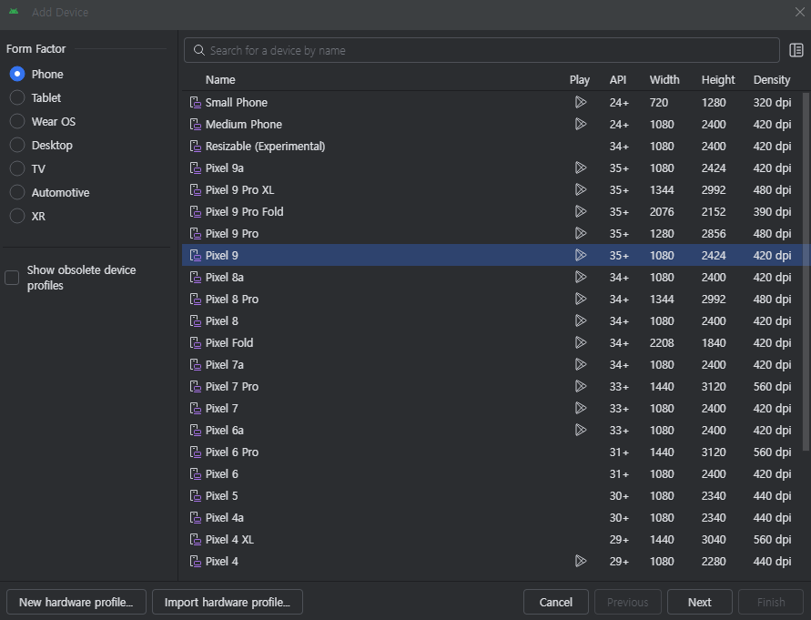 다운이 다 되면 finish 눌러서 창 닫기. Device Manager에 Pixel 9이 제대로 설치된 것이 보인다. 실행 버튼을 누른다.