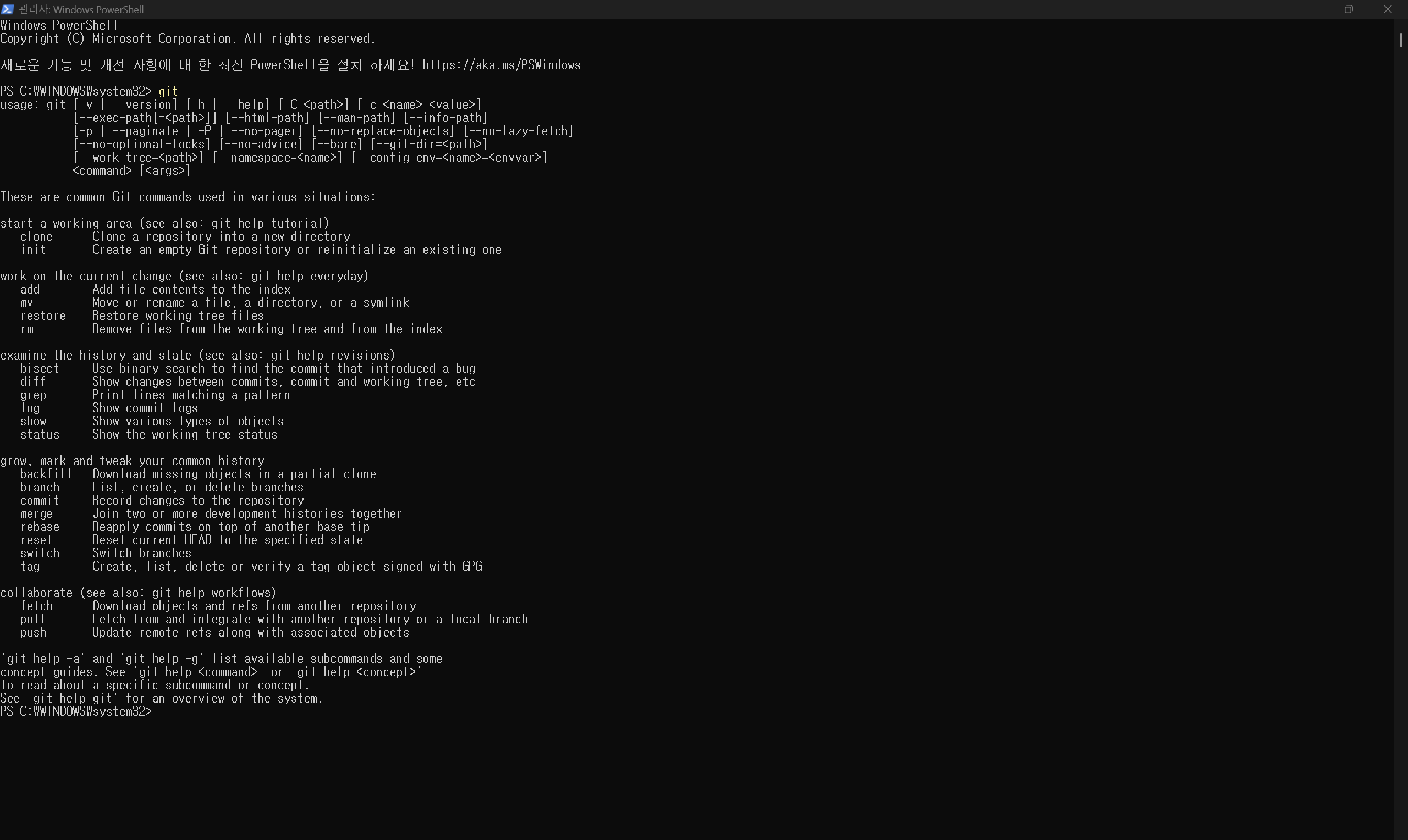 설치가 잘 됐는지 확인하기 위해 시작 메뉴에서 powershell을 실행하고 'git'이라고 입력 후 엔터. (나도 모르는데 일단 하라니까 하는 거임)